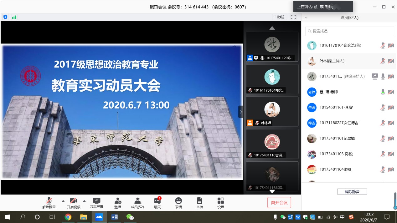 2017级思想政治教育专业实习动员大会于2020年6月7日下午13:00在腾讯会议线上顺利举行,直播性爱 副院长许瑞芳及章瑛、史俊、翟贤亮和叶林娟等老师参加,会议特别邀请了何静、李睿、朱诗妤三位学长学姐进行经验分享。